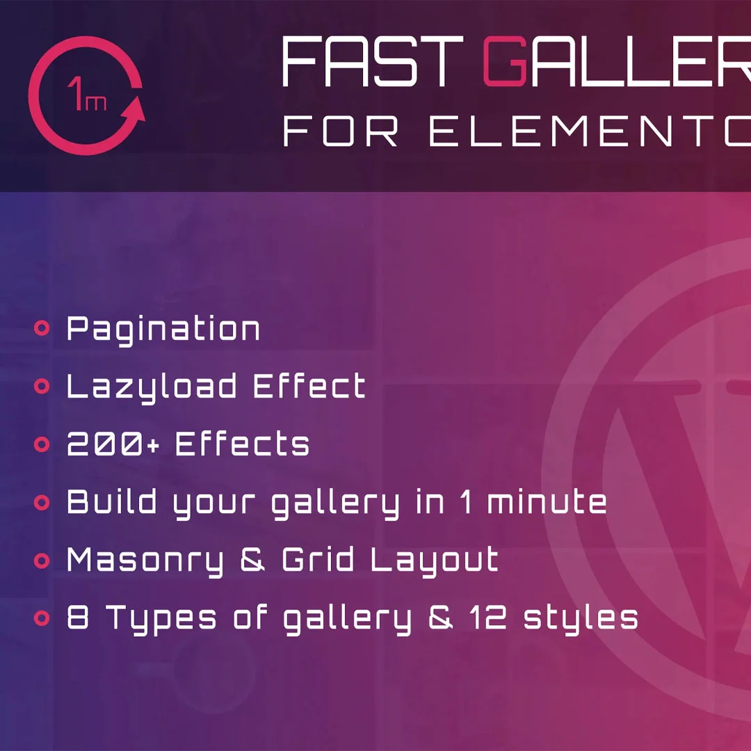 Welcome to Fast Gallery for Elementor. With this awesome plugin you can build your gallery in 1 minute using Elementor.
