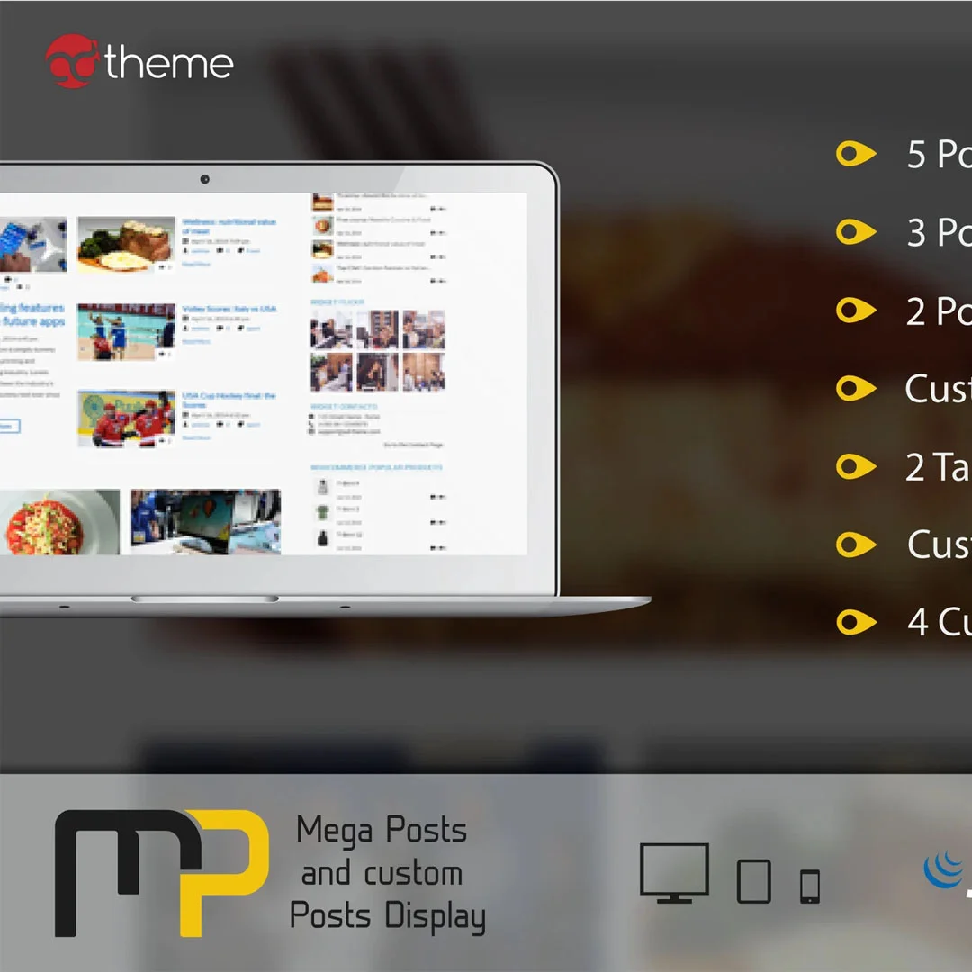 Widget Ready with 4 Custom Widgets: Mega Posts, Woo Mega (WooCommerce posts), Flickr, and Contacts